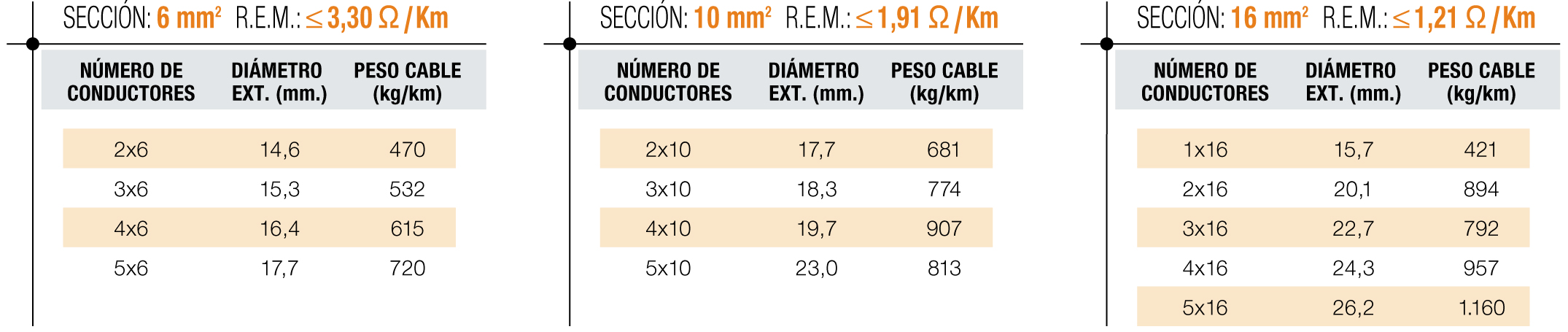 - Cód. colores: – Hasta 5 conductores: S/UNE 21089-1 (HD 308-S2) – 6+ conductores: 1 AM/VDE, resto numerados, S/UNE-EN 50334