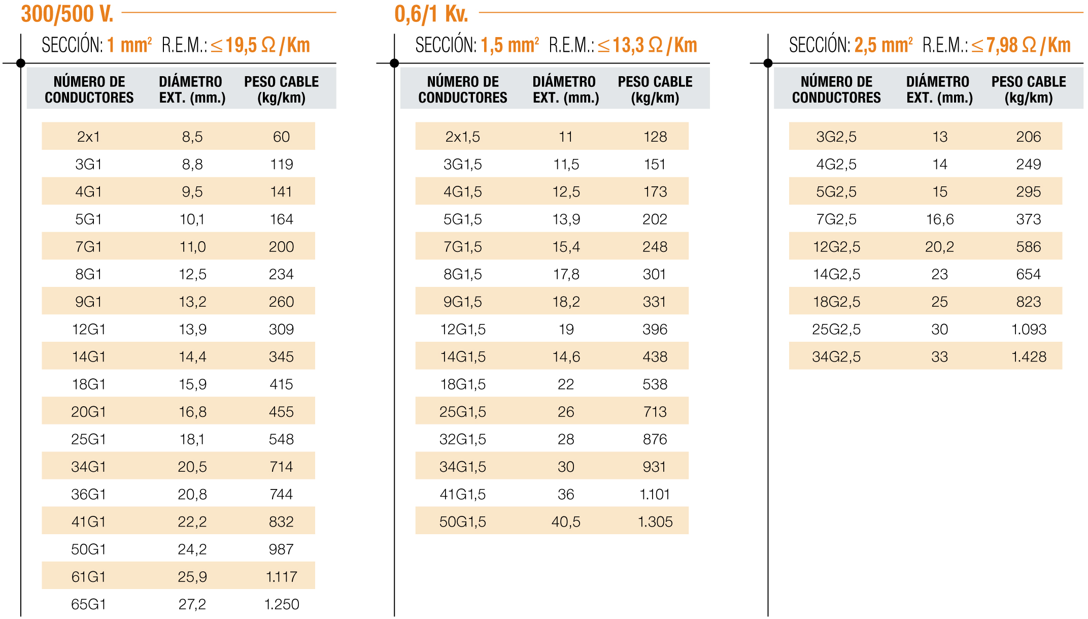 • TENSIÓN DE SERVICIO 300/500 V. hasta 1 mm²; 0,6/1 V. desde 1,5 mm²