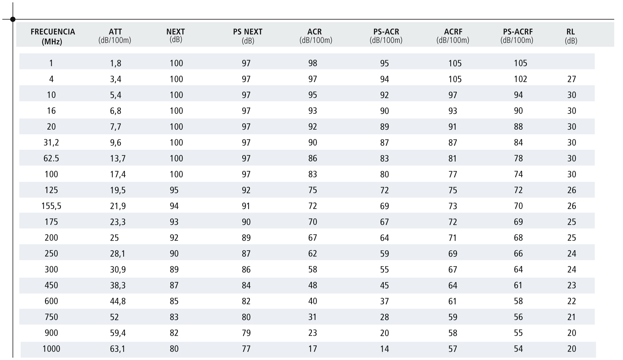 - Desequilibrio de capacitancia (par a tierra): ≤ 1500 pF/Km