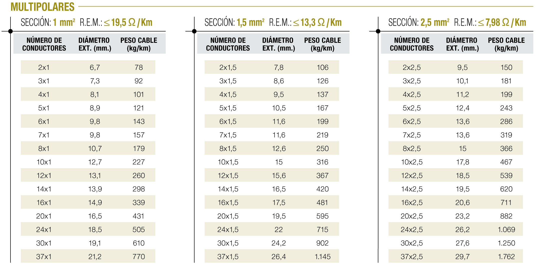 - Cód. colores: – Hasta 5 conductores: 1 AM/VDE, S/UNE 21089-1 (HD 308 S2) – 6+ conductores: 1 AM/VDE, resto negros numerados, S/UNE-EN 50334 – Pares: Negro/azul numerados