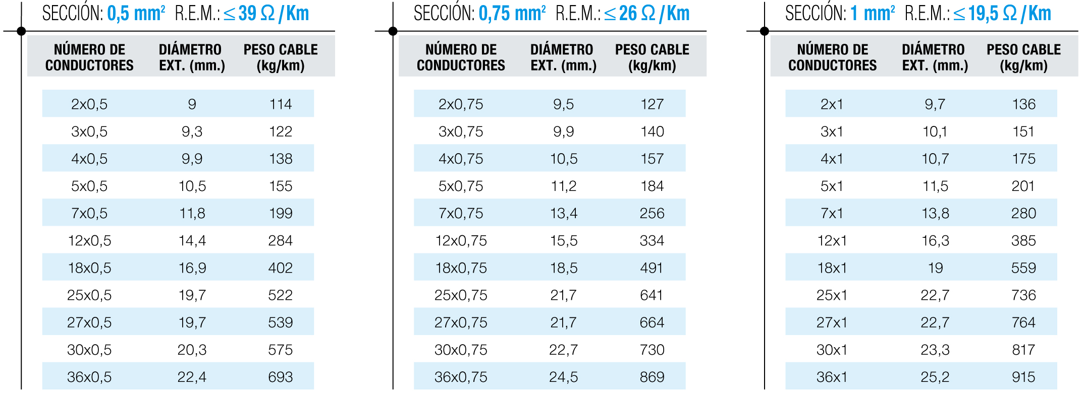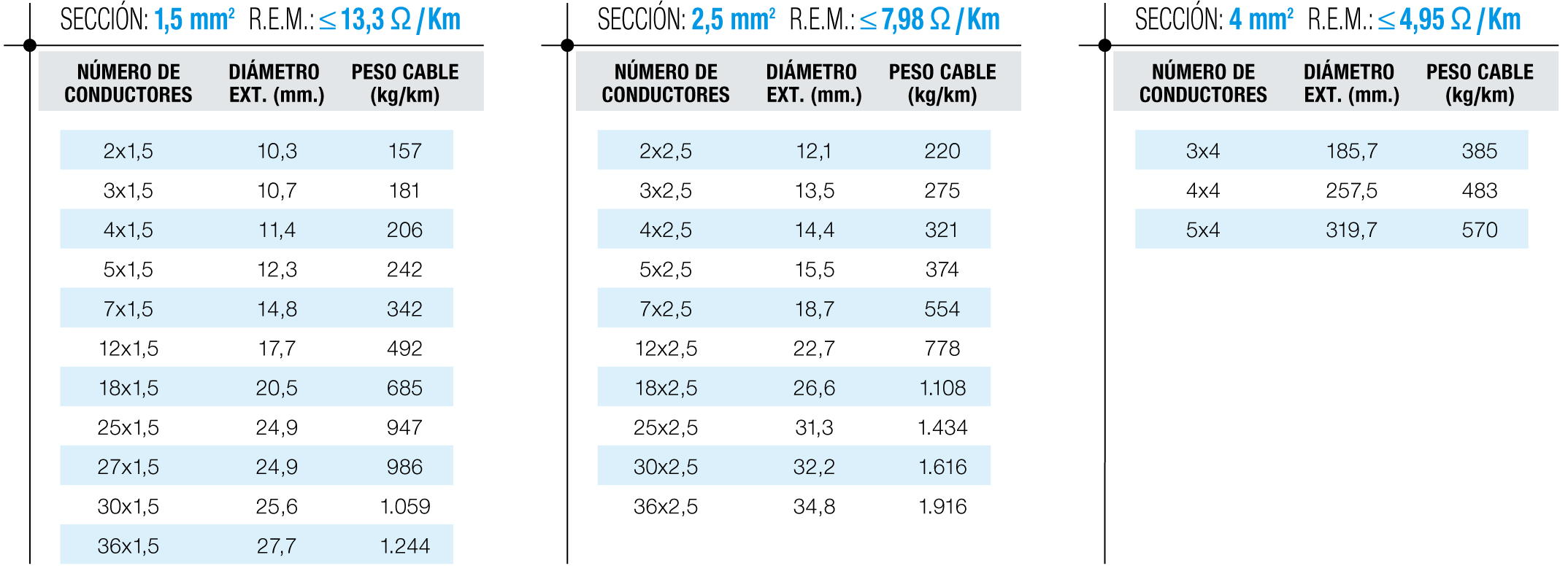 - Cód. colores: Negros numerados según lo dispuesto en la Norma DIN VDE 0293; unipolar amarillo/verde a partir de 3 conductores