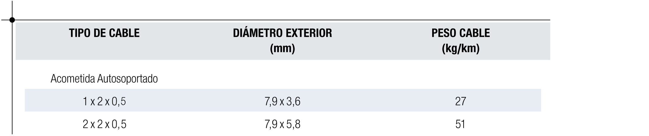 • Conductores: Formados por dos hilos de cobre electrolítico recocido de 0,5 mm de diámetro dispuestos en paralelo junto con un alambre de acero galvanizado de 0,6 mm.
