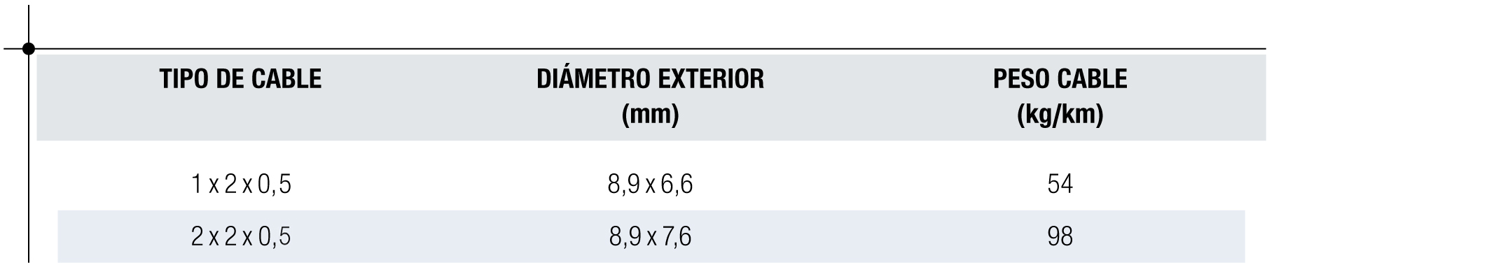 - Conductores: Formados por 2 hilos de cobre electrolítico recocido de calibre 0,5 mm de diámetro dispuestos en paralelo.